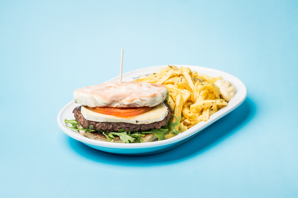 160g brutos, rúcula, tomate frito, queijo brie e manteiga de alho
