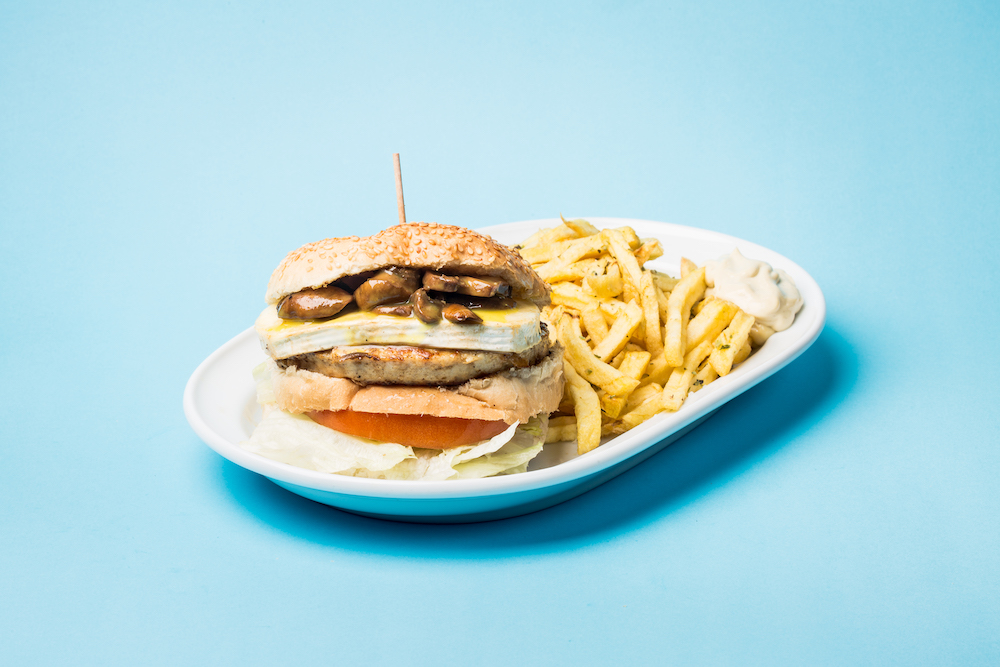 120g brutos de frango, alface, tomate, cogumelos, queijo brie e molho de mostarda e mel